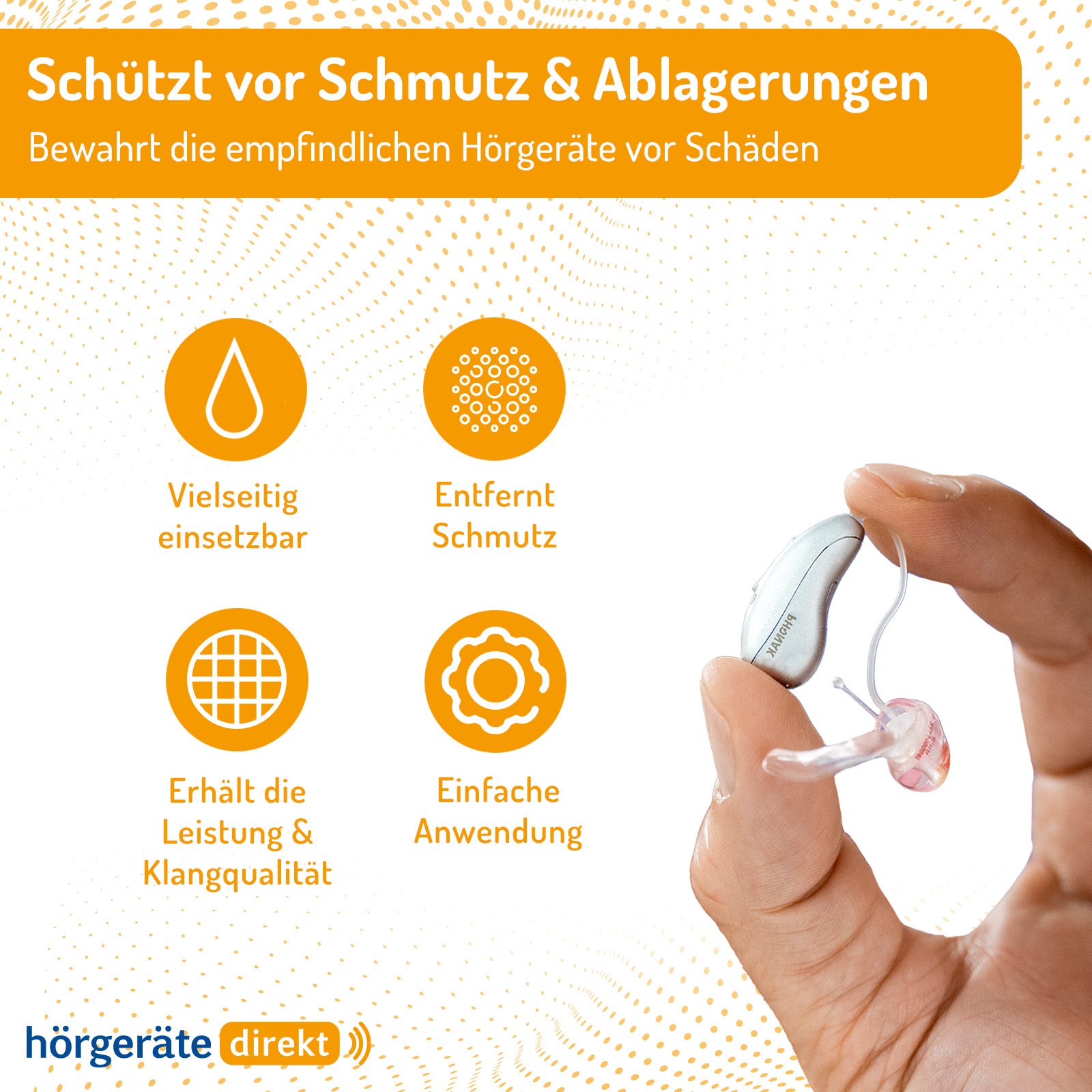Das Direkt Reinigungsspray bietet Ihnen eine zuverlässige und sanfte Reinigungslösung für Hörgeräte, maßgefertigte Ohrstücke, Gehörschutz und In-Ear-Kopfhörer. Die speziell entwickelte Formel entfernt effektiv Schmutz, Ohrenschmalz und andere Ablagerungen, ohne empfindliche Oberflächen zu beschädigen.